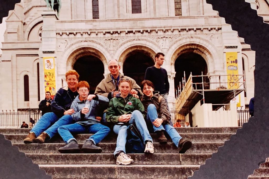 In 2000 besluiten we – met de kinderen – ons 20-jarig huwelijk te vieren in Parijs. Met de caravan zodat we voor Roos wat meer mogelijkheden hebben om glutenvrij te eten. En natuurlijk gecombineerd met Disneyland Parijs, want vier dagen monumenten en wandelen kunnen we Merette niet aan doen. Het is ons laatste analoge fotojaar, en dat is te zien: we hebben welgeteld één foto in Parijs waar we met zijn vijven op staan…. Natuurlijk bezoeken we samen de Notre Dame en daar staan de drie dames in elk geval wel op de foto.
