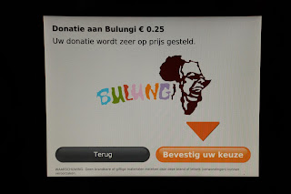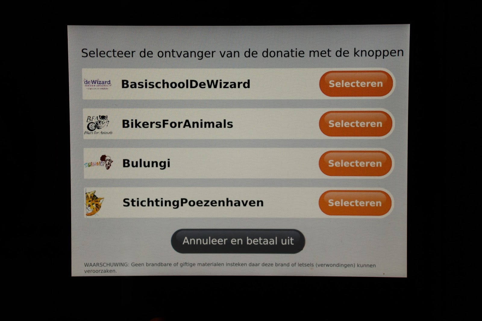 Maar… we weten niet precies hoe het werkt. Dus beginnen we met één fles. Natuurlijk mag Merette het werk doen. Fles erin en zie… de automaat vraagt of je meteen een bonnetje wilt of dat je wilt doneren. Doneren dus. De vier goede doelen verschijnen op het scherm, compleet met logo. We kiezen voor Bulungi en zie… ons logo verschijnt groot op beeld en we moeten nog een keer bevestigen. Dat doen we natuurlijk. Het bonnetje is de laatste verrassing: een bedankje voor de donatie namens ons, alweer met logo!Jumbo! Daar worden wij blij van! Heel blij!
