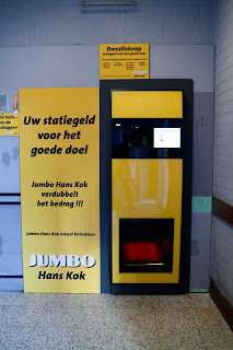 We zetten de volle tassen in de auto en gaan naar de automaat. Boven de automaat hangt een geel bord waarop de vier goede doelen staan vermeld. Naast de automaat hangt nog een verrassing: Jumbo verdubbelt uw statiegeld! Dat wist ik nog niet eens!